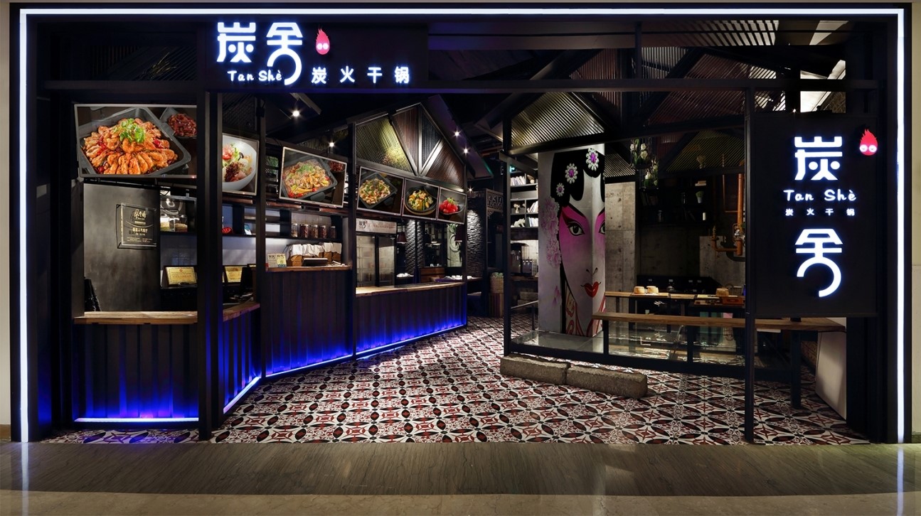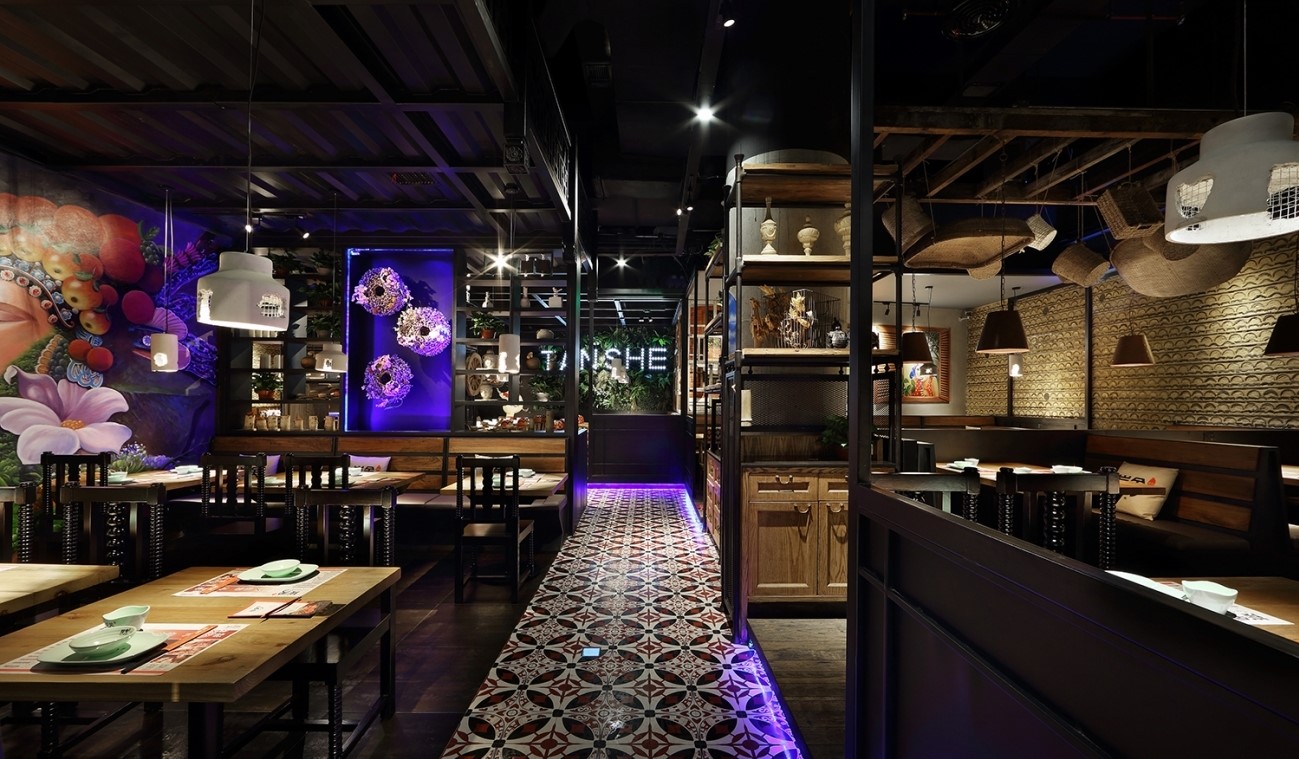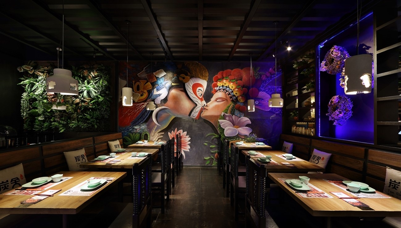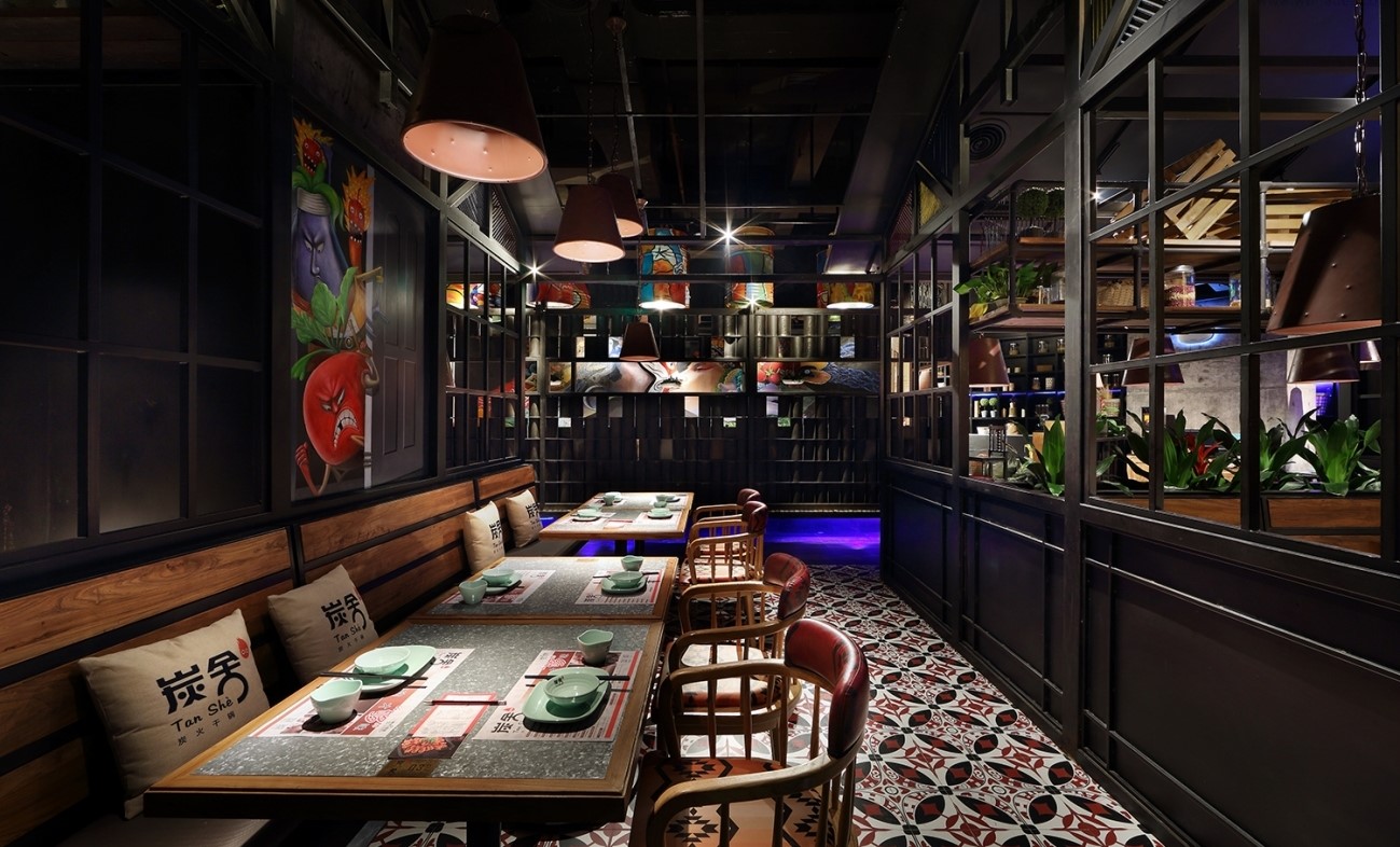 炭舍,是一個堅(jiān)持傳統(tǒng)風(fēng)味與現(xiàn)代工藝相結(jié)合的干鍋餐廳,本案以天府之國四川的地域風(fēng)情、人文特色和建筑精髓為氣質(zhì)導(dǎo)向,設(shè)計(jì)師利用現(xiàn)代穩(wěn)重手法,結(jié)合材料及工藝,將川式建筑中常見的穿斗式屋架造型簡化為隔斷框架運(yùn)用于餐廳中,使得平面布局靈活,空間變化有序。另外,本案延續(xù)了炭舍以往的輕工業(yè)風(fēng),大量使用氣質(zhì)冷硬的黑色鋼架,并用顏色活潑的水彩畫來軟化鋼板的冷酷氣息,營造出休閑懷舊的用餐空間