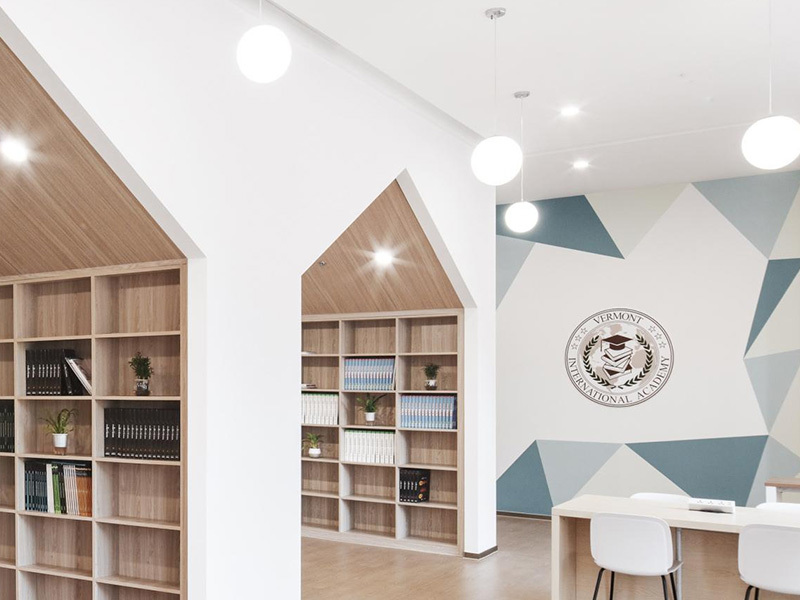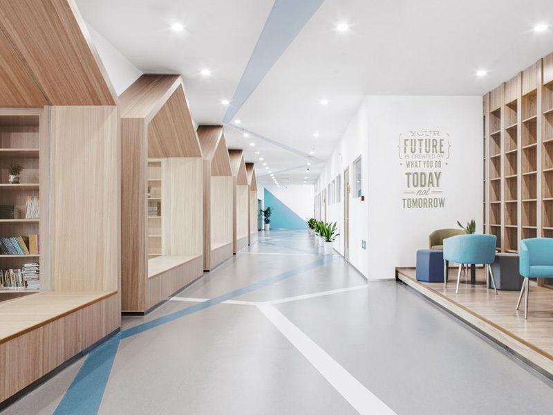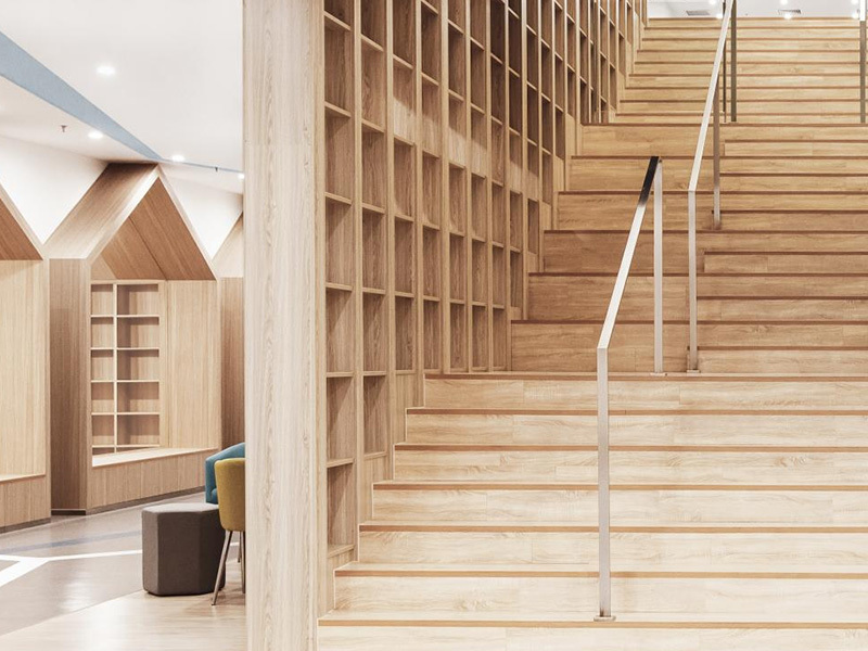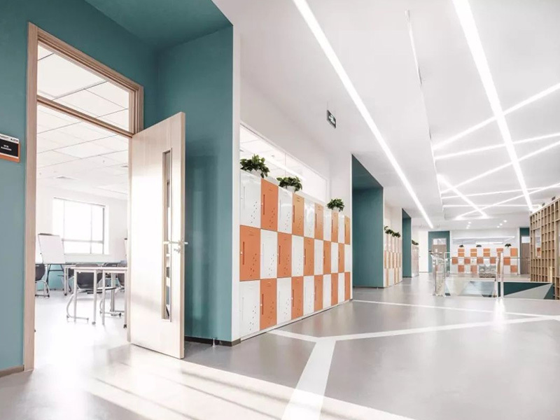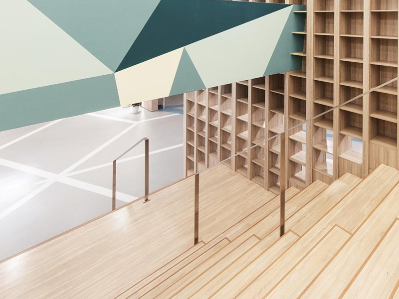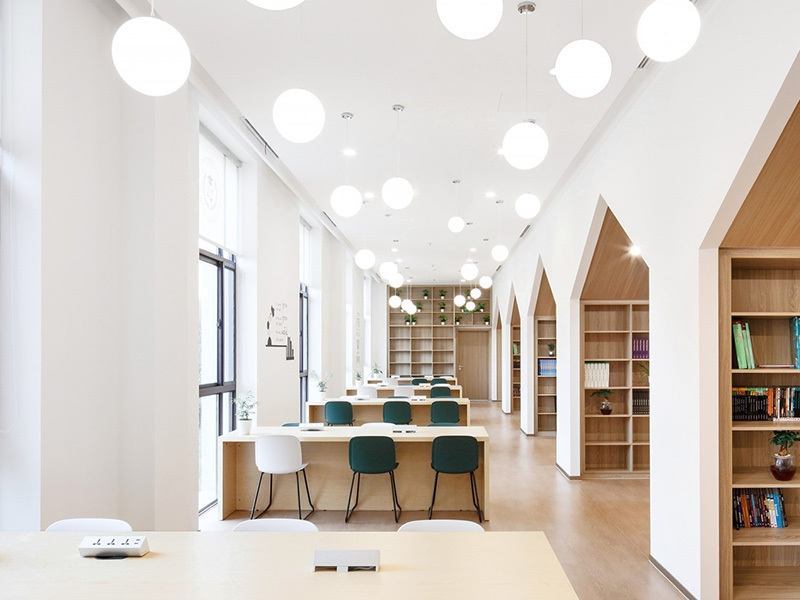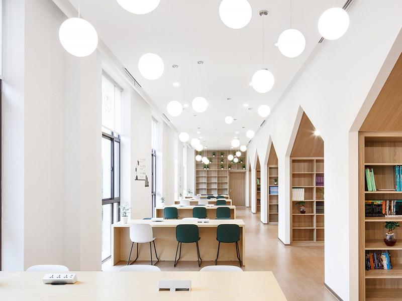 學??偣灿兴膶?,首層主要布置學生共享區(qū),設置大樓梯、圖書館、音樂教室、美術教室、物理教室和化學教室,及教師辦公區(qū);二層和三層共設置16間學生標準教室,其中寬敞的共享交流空間,亦方便教師和學生的課外交流,地下一層主要為食堂兼多功能廳,后廚區(qū)域配置完整。