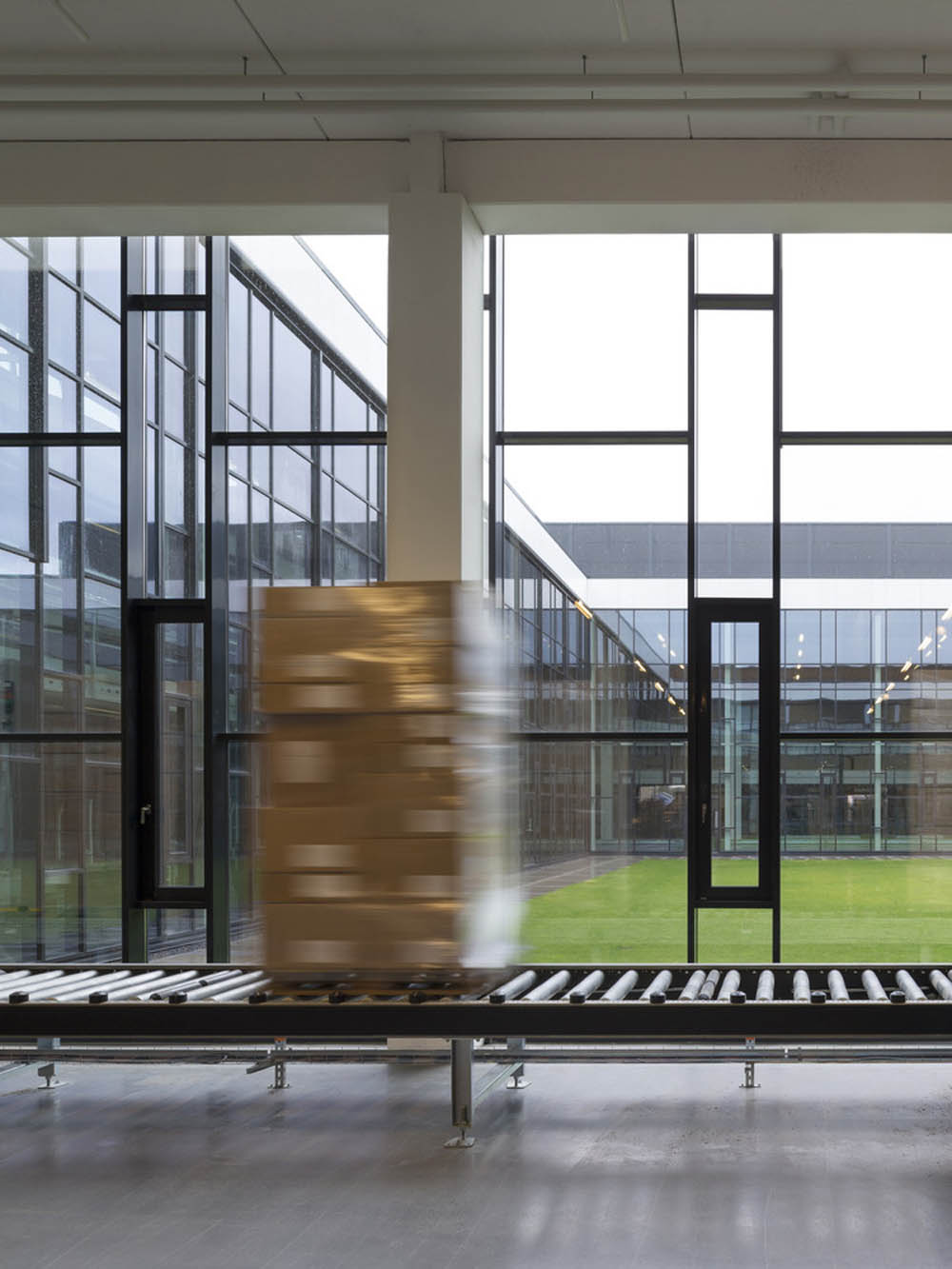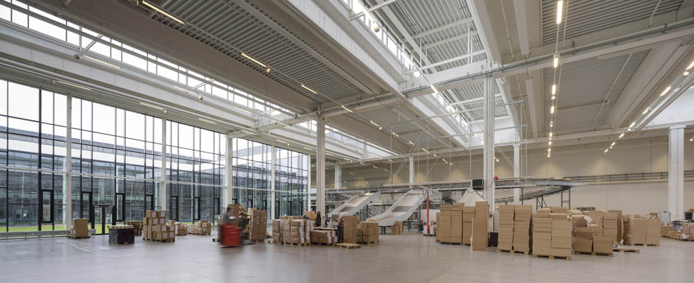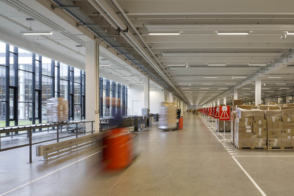 該中心計劃占據(jù)圍繞一條主干道的三個平行帶。其中一個包含主要入口、辦公室和員工設(shè)施,以及一個帶有卡車裝載坡道的區(qū)域,而第二個包含一個自動分揀設(shè)施,第三個是全自動小型裝載商店。