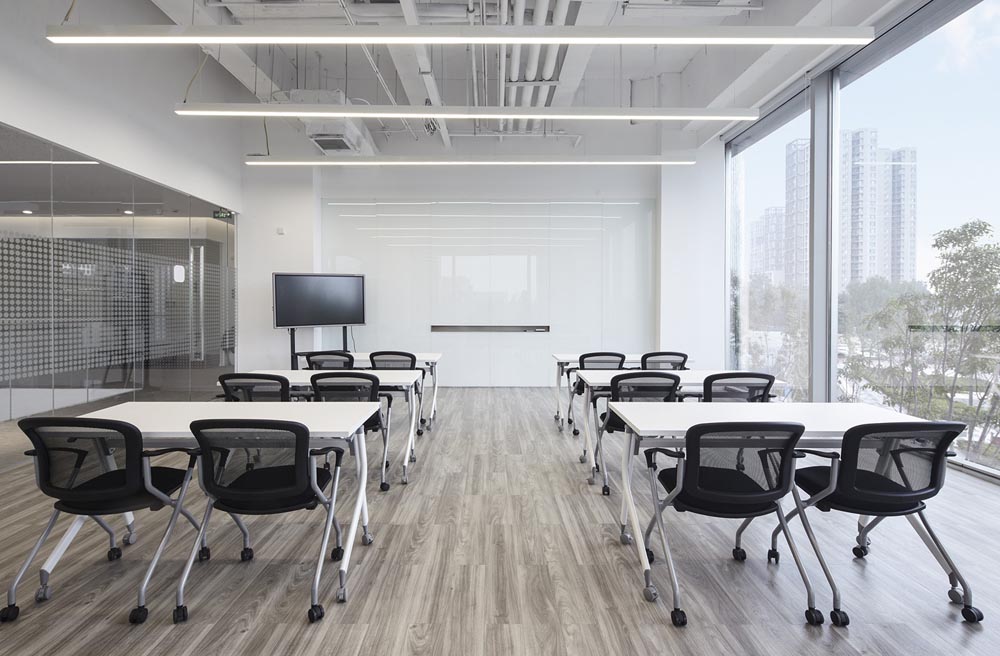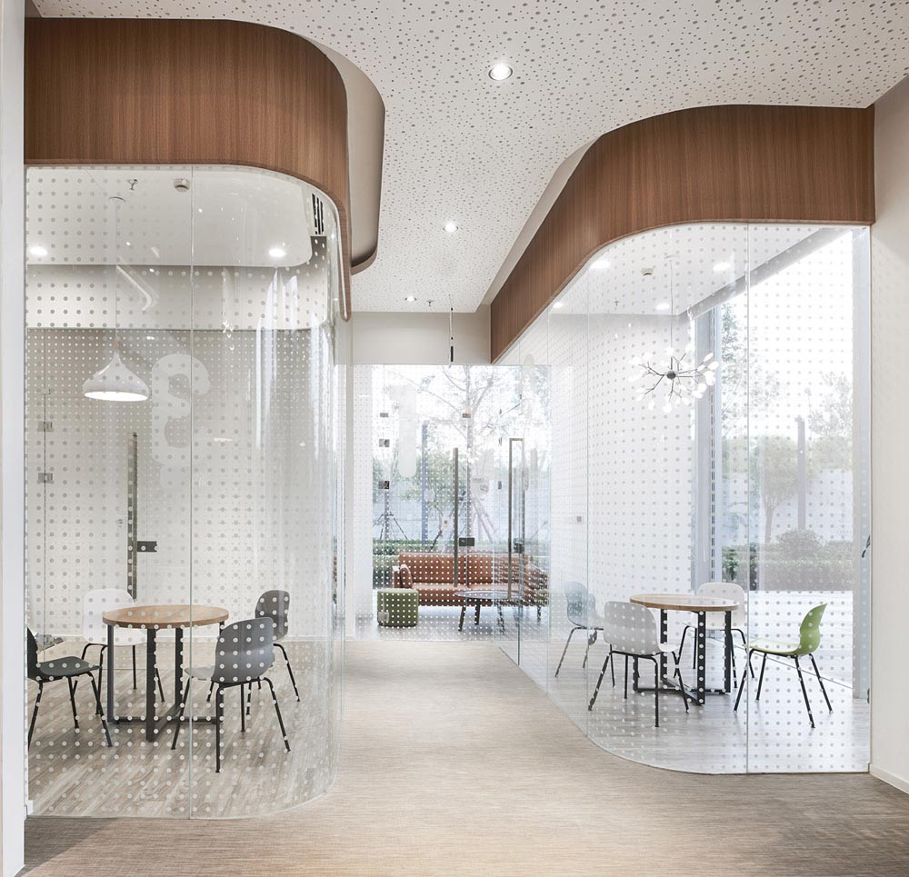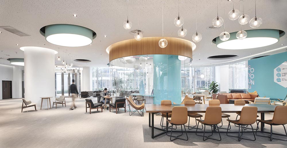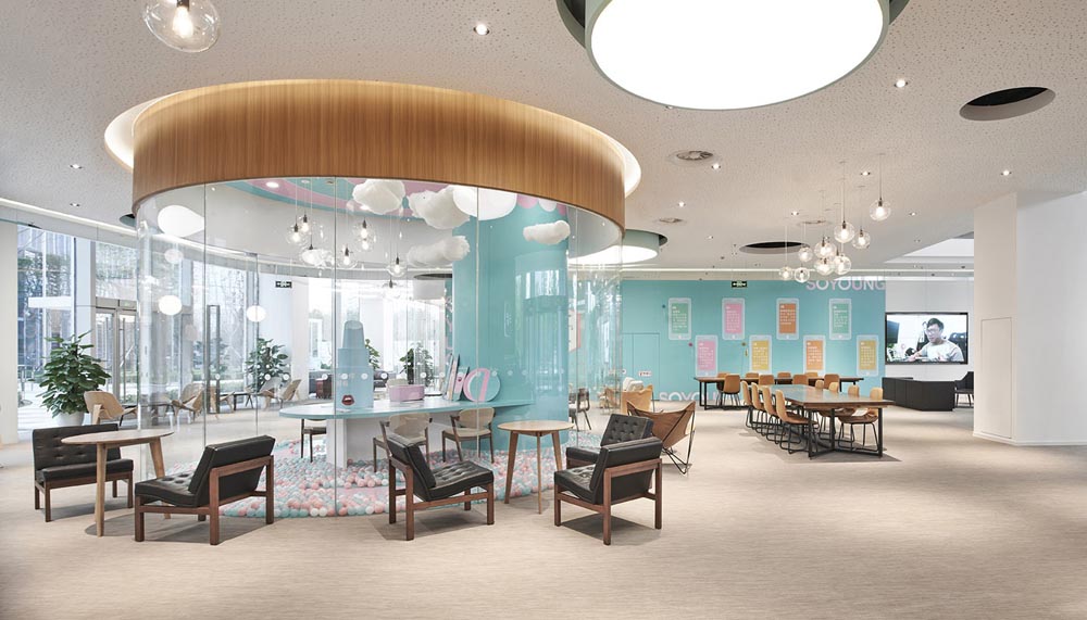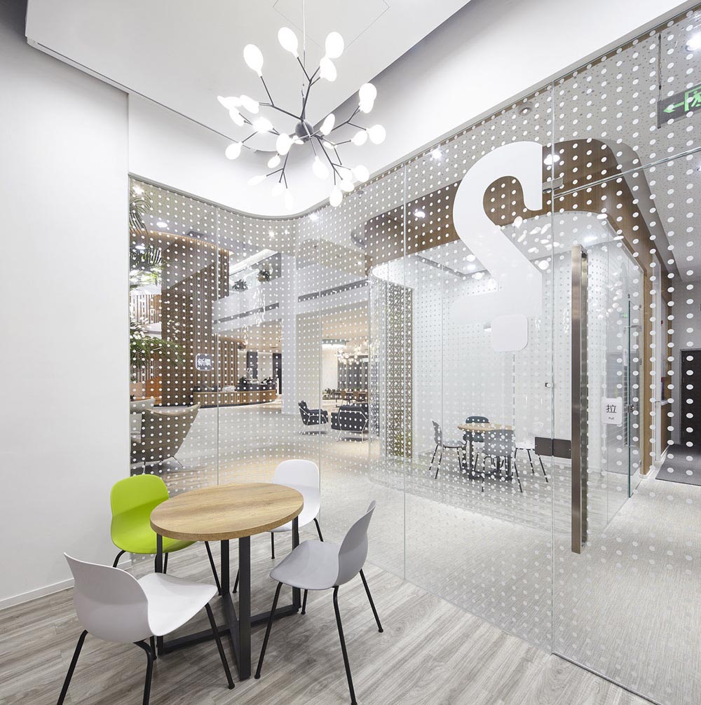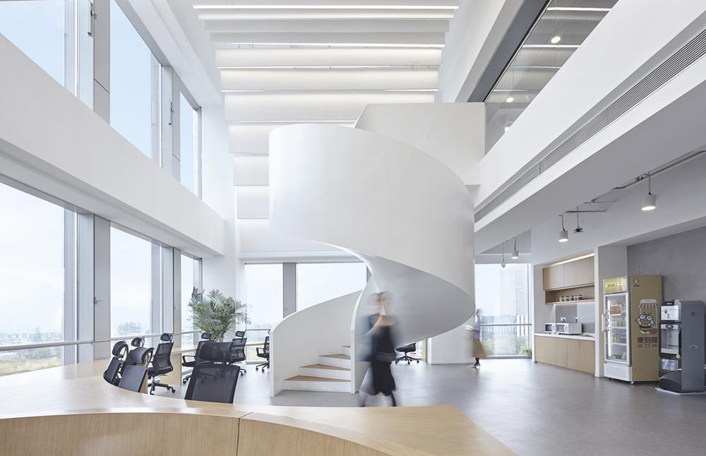 科技、年輕時(shí)尚、活力陽(yáng)光、一廳五島、螺旋樓梯、白色鋼網(wǎng)樓梯,原建筑大廳入口是挑高二層的開放空間,建筑南側(cè)向陽(yáng)面每?jī)蓪邮秦灤┑拇拱慰臻g,設(shè)計(jì)師根據(jù)原建筑結(jié)構(gòu)和空間層次特點(diǎn)設(shè)置“一廳五島”的辦公格局。