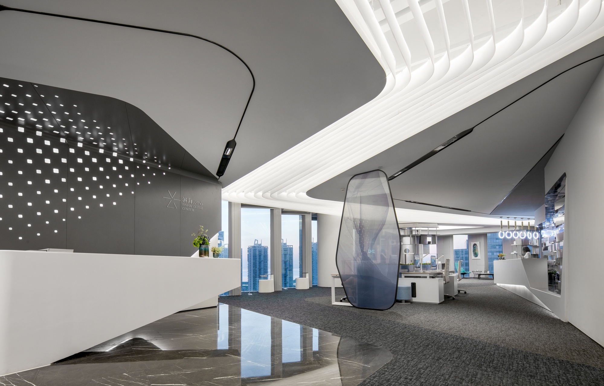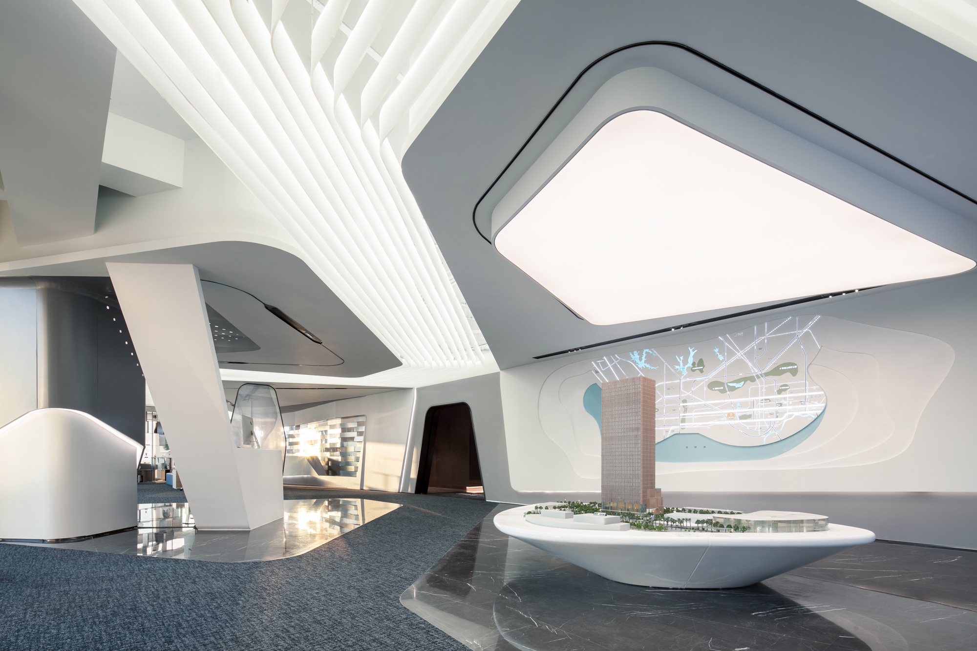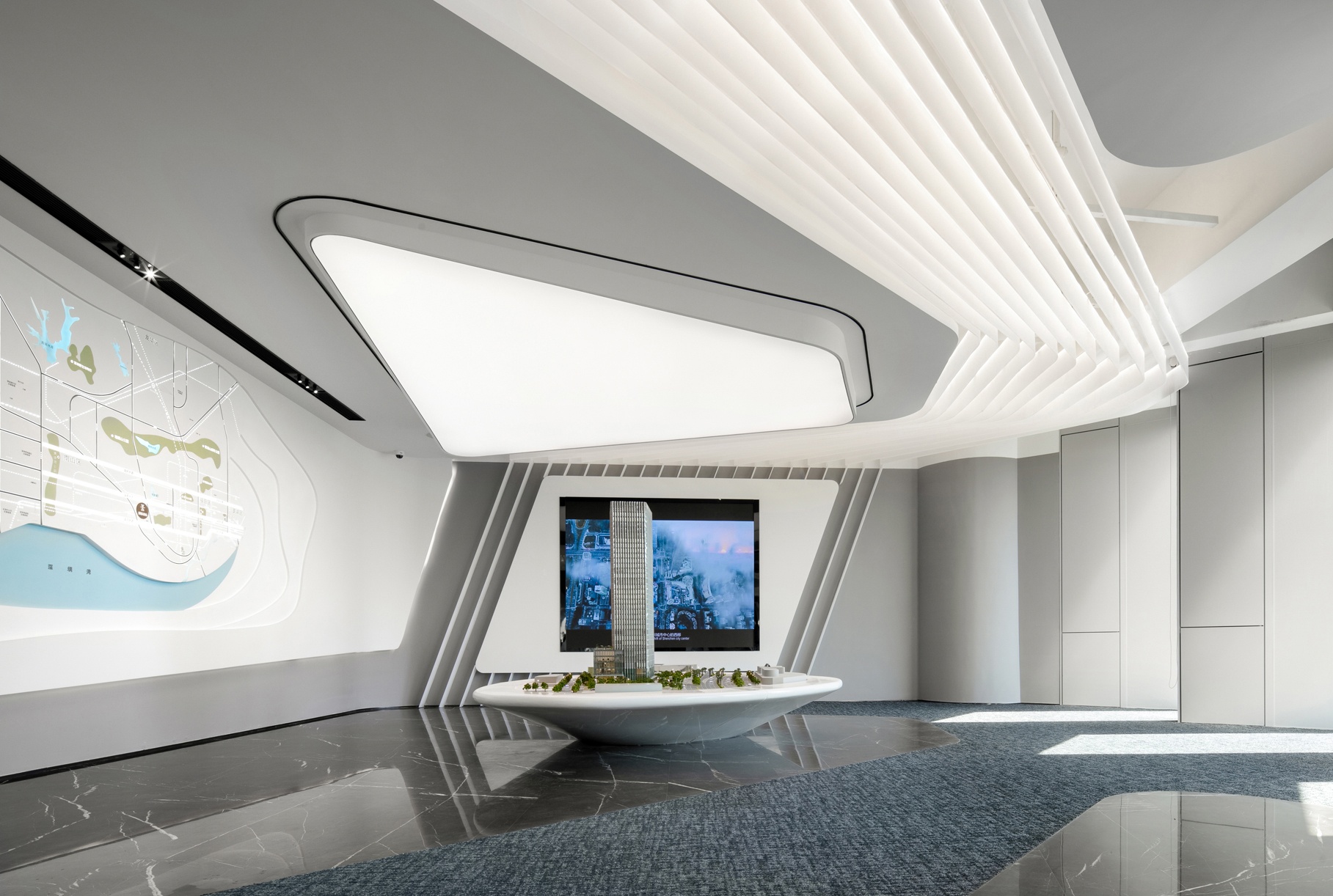 光是一種無形無聲的語言 品質彰顯于燈光之下,光影帶動感情升華 自然光線與筒燈、燈帶等廳內光源相結合 在交織輝映中為空間譜寫光影旋律,展示廳內的空間形體以圓弧與曲面為主 輕盈靈動的線、面賦予固體更多表情變換 些許鮮麗的顏色點綴在素潔純凈的大廳內,煥發(fā)出宛如白瓷上釉般的流光溢彩。