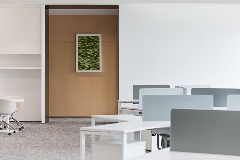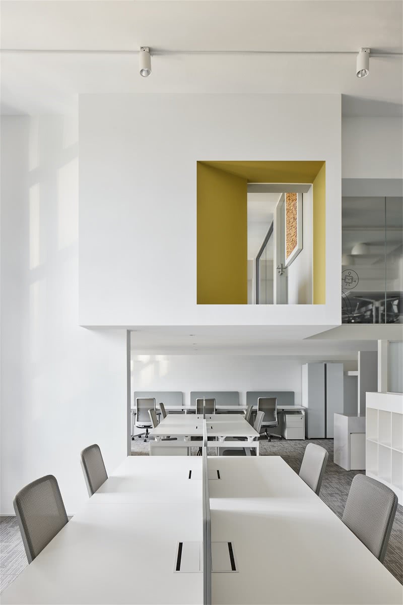 入室,前臺造型層疊構(gòu)建,好似山丘的層巒疊嶂,植被景觀呼應(yīng)著造型,仿若從大自然延伸出的建筑,仿佛“流水別墅”般的異曲同工。 設(shè)計為辦公者打造了不同的辦公組合方式,不同空間及模塊相互掩映,虛實結(jié)合,而借景入室的手法,將景觀、自然、空間融為一體,借此調(diào)節(jié)辦公區(qū)域緊張的氛圍。 工位打破了工整排列的格局,成模塊化的不規(guī)則組合,緊扣靈活辦公的理念。動線上的自由感也為工作氛圍打造出輕松愉悅感。
