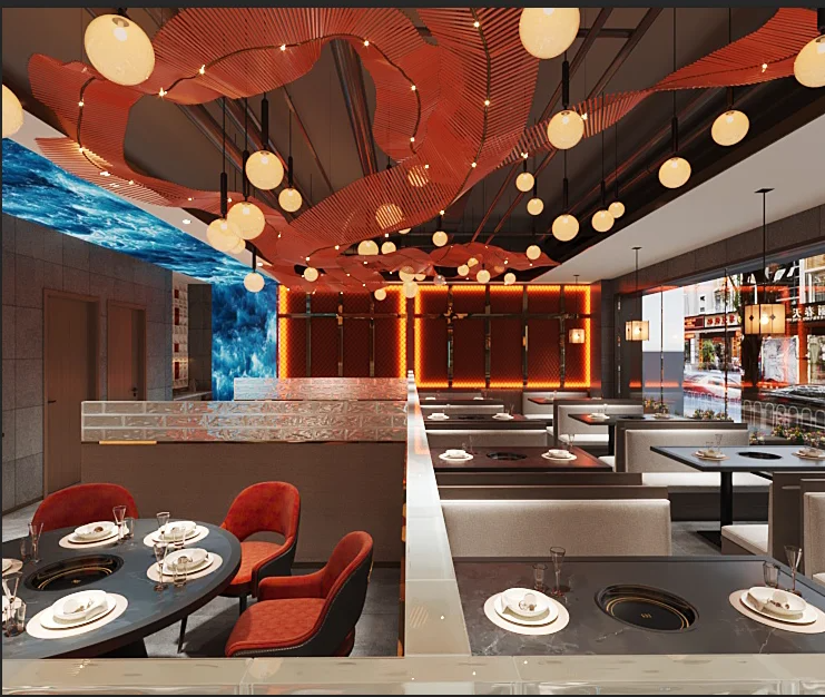 主題特色型:融合地域文化或火鍋特色元素,如川渝風(fēng)融入臉譜、火鍋底料造型,海鮮主題采用海洋藍、貝殼裝飾,精準吸引追求新奇體驗的年輕客群,強化門店記憶點。