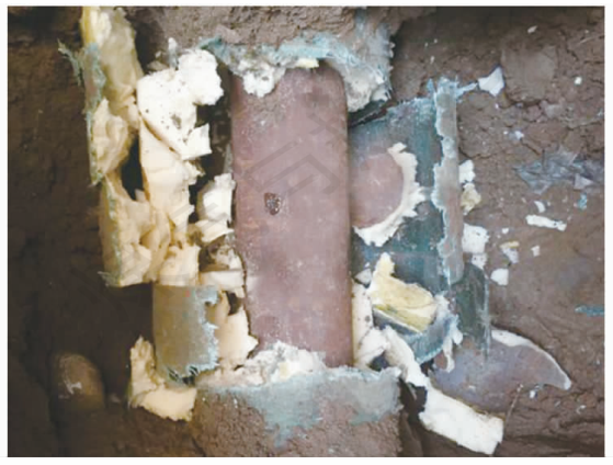 聚氨酯炭化后,由于保溫層體積變小甚至塌縮,PE外護(hù)管存在開裂風(fēng)險(xiǎn)。若PE外護(hù)管發(fā)生開裂,腐蝕性地下水將侵入保溫層,導(dǎo)致工作鋼管腐蝕[4-5]。聚氨酯炭化位置出現(xiàn)的工作鋼管腐蝕穿孔見圖7。由圖7可知,由于該直埋保溫管道聚氨酯炭化,保溫層體積縮小,在土壓力應(yīng)力作用下,PE外護(hù)管表面出現(xiàn)了開裂,地下水進(jìn)入保溫層,工作鋼管在很短的時(shí)間內(nèi)就發(fā)生了腐蝕穿孔。