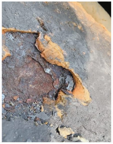 除了工作鋼管腐蝕穿孔外,供熱管道的腐蝕產(chǎn)物還往往呈現(xiàn)層狀。這主要與供熱管道季節(jié)性運(yùn)行有關(guān),腐蝕環(huán)境下,工作管表面的腐蝕產(chǎn)物覆蓋在管道表面,在供暖期,管道徑向膨脹,供暖停止后,管道徑向收縮,但腐蝕產(chǎn)物(主要為氧化鐵)基本不會收縮,導(dǎo)致管體與腐蝕產(chǎn)物剝離,管體露出新的金屬被繼續(xù)腐蝕。如此往復(fù),形成“剝洋蔥”式的腐蝕過程,加速了管道腐蝕[6]。直埋敷設(shè)保溫管道工作鋼管表面的層狀腐蝕產(chǎn)物見圖8。圖8中的保溫管道埋設(shè)環(huán)境土壤濕度較大,保溫層并未進(jìn)水。同樣的,受到腐蝕的架空敷設(shè)保溫管道也存在類似的情況(見圖9)。實(shí)際上,對于保溫層進(jìn)水的直埋敷設(shè)保溫管道,工作鋼管的層狀腐蝕產(chǎn)物是腐蝕進(jìn)程中的一個(gè)階段,最終導(dǎo)致壁厚減薄甚至穿孔。