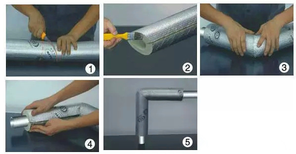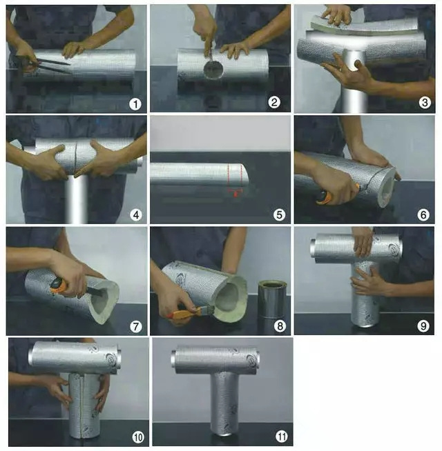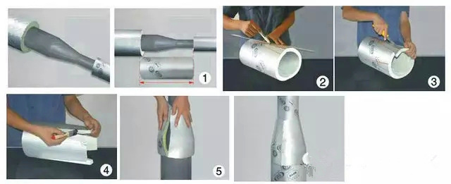2、工序:取一段合適長度的管材,按所示原理從中間切開;在兩個(gè)切面上涂上膠水,粘和成90度彎頭;將彎頭套在管道上;從兩端向中間粘和管材的開口縫,直至封合。如下頁圖所示: