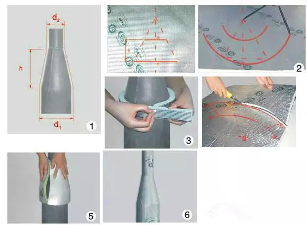 量出變徑管兩頭的管徑并加上兩倍板材厚度,得到最大、最小直徑及漸縮部分的高度。將量得的尺寸標(biāo)在板材上,按如圖所示方法作圖。用相同厚度的RPEFLEX細(xì)條量出大管徑端的周長,沿A′、B′、C′、D′切割;安裝到變徑管,用膠水粘和切面,并與兩端直管粘牢。如下頁圖所示: