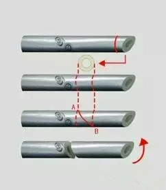 1、原理:垂直切下一小塊管材,放在管材上,記下管材的外徑,并且在記號(hào)上畫下它的切面,如圖所示:沿A-B線切下一個(gè)45度的管面,顛倒一個(gè)管面,使其與管面的另一部分粘和即可。
