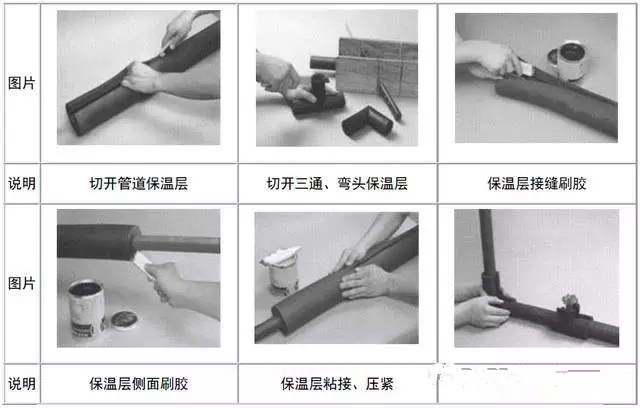 ②.膠水涂刷時(shí)必須在保溫管殼內(nèi)部和管道外壁進(jìn)行滿涂。在保溫材料粘接時(shí),必須將管道表面的雜物、灰塵、油污清理干凈,以保證膠水的粘接效果。